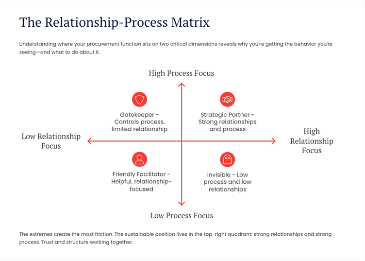 Most procurement dysfunctions can be mapped onto a simple grid. On one axis, you’ve got your relationship focus: how embedded, trusted, and collaborative you are with internal stakeholders. On the other, your process focus: how structured, governed, and enforceable your systems are.