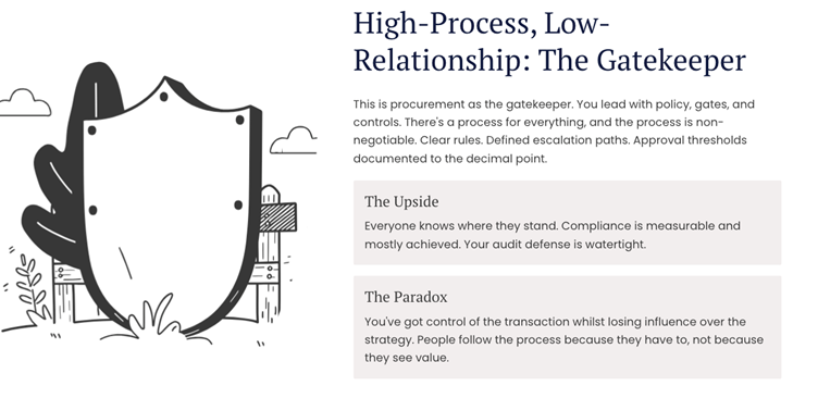 This is procurement as the gatekeeper. You lead with policy, gates, and controls. There’s a process for everything, and the process is non-negotiable. Clear rules. Defined escalation paths. Approval thresholds documented to the decimal point. When someone asks for an exception, the answer is usually no, and definitely not without following steps A through F first.